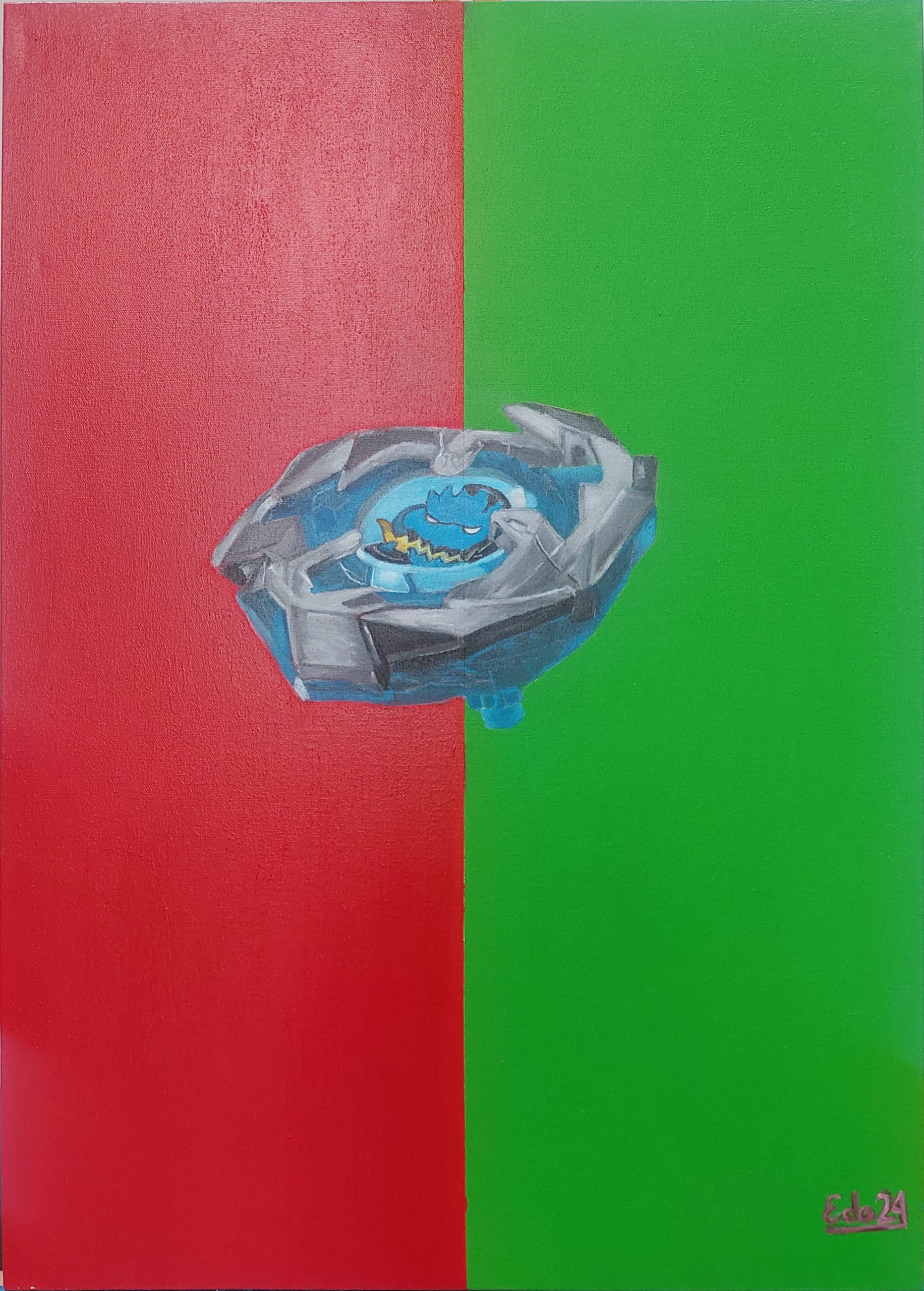 Beyblade yang berputar cepat di tengah lukisan menjadi simbol dari persaingan itu sendiri, dinamis dan penuh energi. Namun, seperti putaran yang seimbang, kompetisi harus tetap berjalan dalam batas-batas yang sehat, di mana setiap pihak menghargai keberadaan lawan dan menjaga semangat fair play.